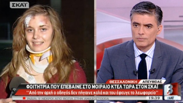 O λόγος για τη φοιτήτρια Ξένια Αλμπάνη, η οποία, έχοντας ακόμα τους επιδέσμους από τον τραυματισμό της, μίλησε στο ΣΚΑΪ και στον Νίκο Ευαγγελάτο, για τις τρομακτικές στιγμές που έζησε μέσα στο λεωφορείο του ΚΤΕΛ. Εκεί, όπου έχασαν τη ζωή τους δύο φοιτήτριες...